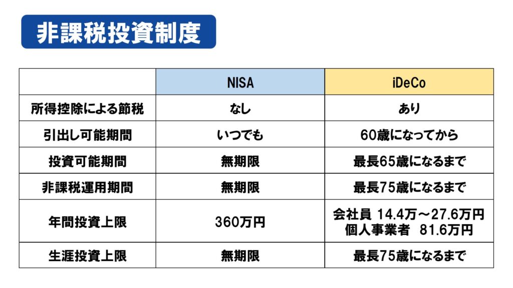 あとは年間で投資できる金額や生涯を通じて投資できる金額についても、NISAとiDeCoで異なります。