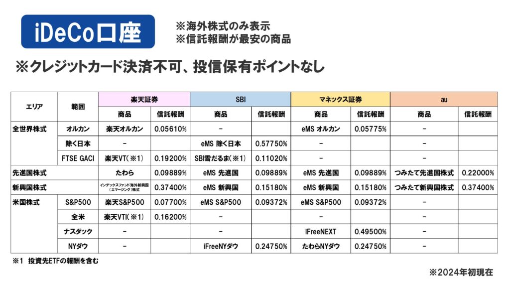 よってiDeCoにおける証券会社選びは、どの投資対象エリアにどれだけ安い手数料で投資できるかという点のみが判断材料となります。
