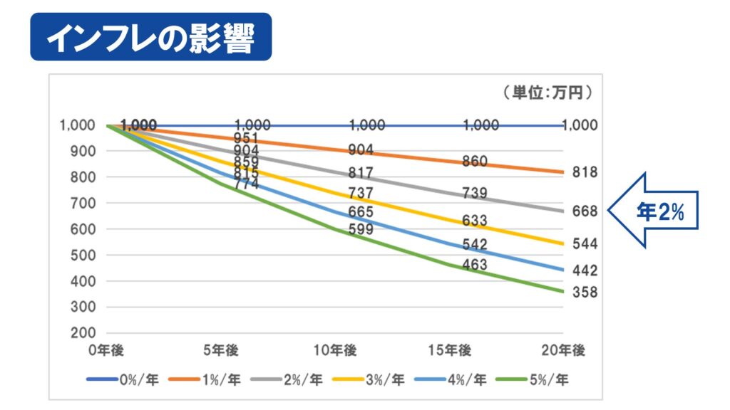 例えば1000万円の銀行預金があったとしても、もしインフレが年2%ずつ進行すれば20年後には668万円分の役割しか果たせないことを意味します。