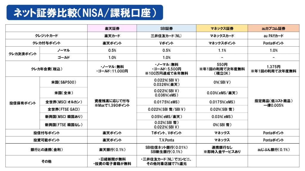 あるいはdポイントを貯めている、もしくは特にどの経済圏も使っていないという人はマネックス証券がノーマルカードでも1.1%のポイント還元を受けられるため、有力な候補となってきます。