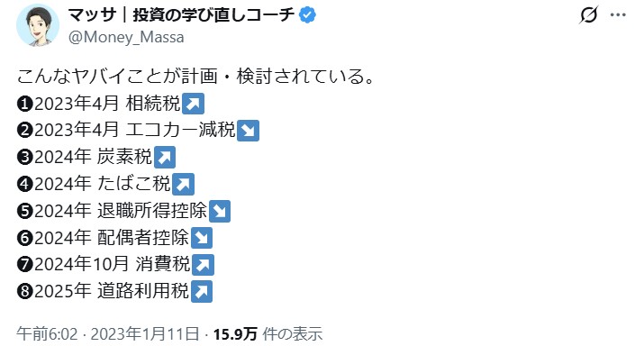 投資をする人は税制優遇を受けて豊かになって、投資をしない人は増税に苦しむだけの立場になる ──そういう制度だということを認識しておくべきなのだと思います。