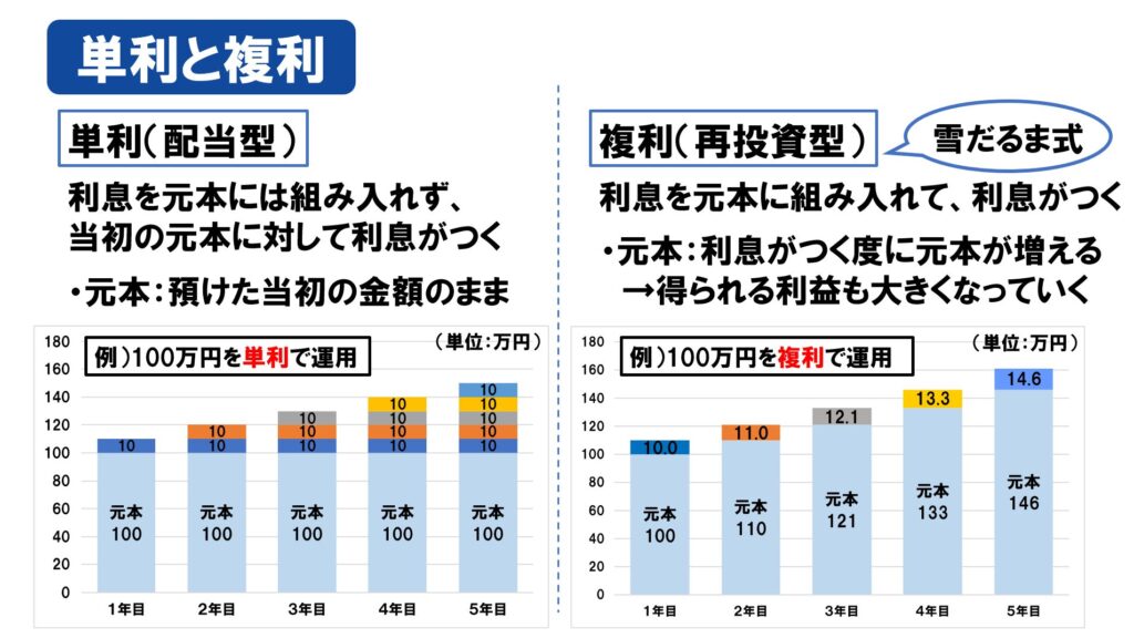 一方、複利は元本から得られた利息を元本に組み入れて、そこに利息がつく仕組みです。