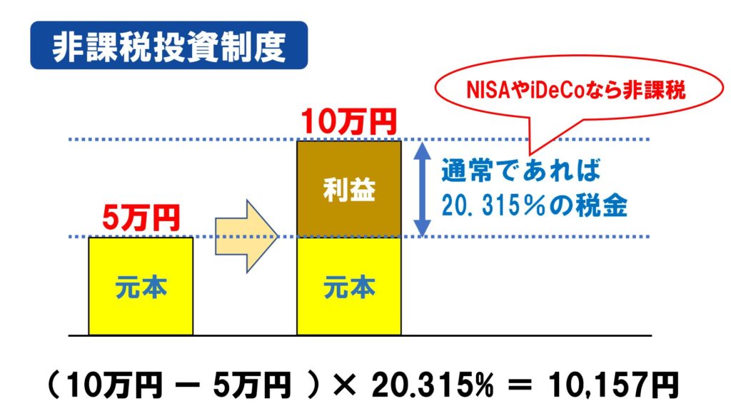 非課税投資制度とはどういったものかと言いますと、投資によって得られた利益に対しては通常、20.315%の税金がかかりますが、NISAやiDeCoを活用したうえで投資をすれば、この分が非課税となります。